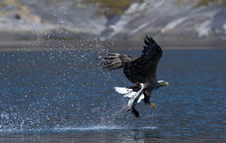 Jeg fikk anledning av min snille kone å dra til jerveskjulet i går kveld på tross av 4 dager borte i forrige uke på leik i Sverige. Jeg ankom skjulet kl 23.30. Da var det halvmørkt og litt snø i luften. 2 voksne havørner lettet fra åtet og ble borte i vårnatta. Jeg krøp i posen kl 24.00 og hadde vekking kl 02.30. Da jeg sto opp var det fortsatt ikke fotolys men en varm kopp kaffe smakte godt. Så var det bare å speide utover myra etter jerven. Kl 03.30 kom det 2 rødrever inn til åta. Den ene stakk med en gang mens den andre begynte å spise. 03.50 sluttet den å spise og ble litt urolig. Jeg speidet utover myra. Plutselig var han der: JERVEN. Det er like artig hver gang den kommer. Den ble der i tilsammen 45 min. Den spiste av elgen og løp litt rundt omkring. Veldig artig at dette skjer ved egen åteplass i hjemtraktene. Etter at jerven var dratt kom det 4 stk havørner ned for å spise av en rev jeg hadde lagt ut. Etter jervebesøket sloss 2 av havørnene flere ganger. Dette ble en riktig hyggelig morgen nord i Nordland.